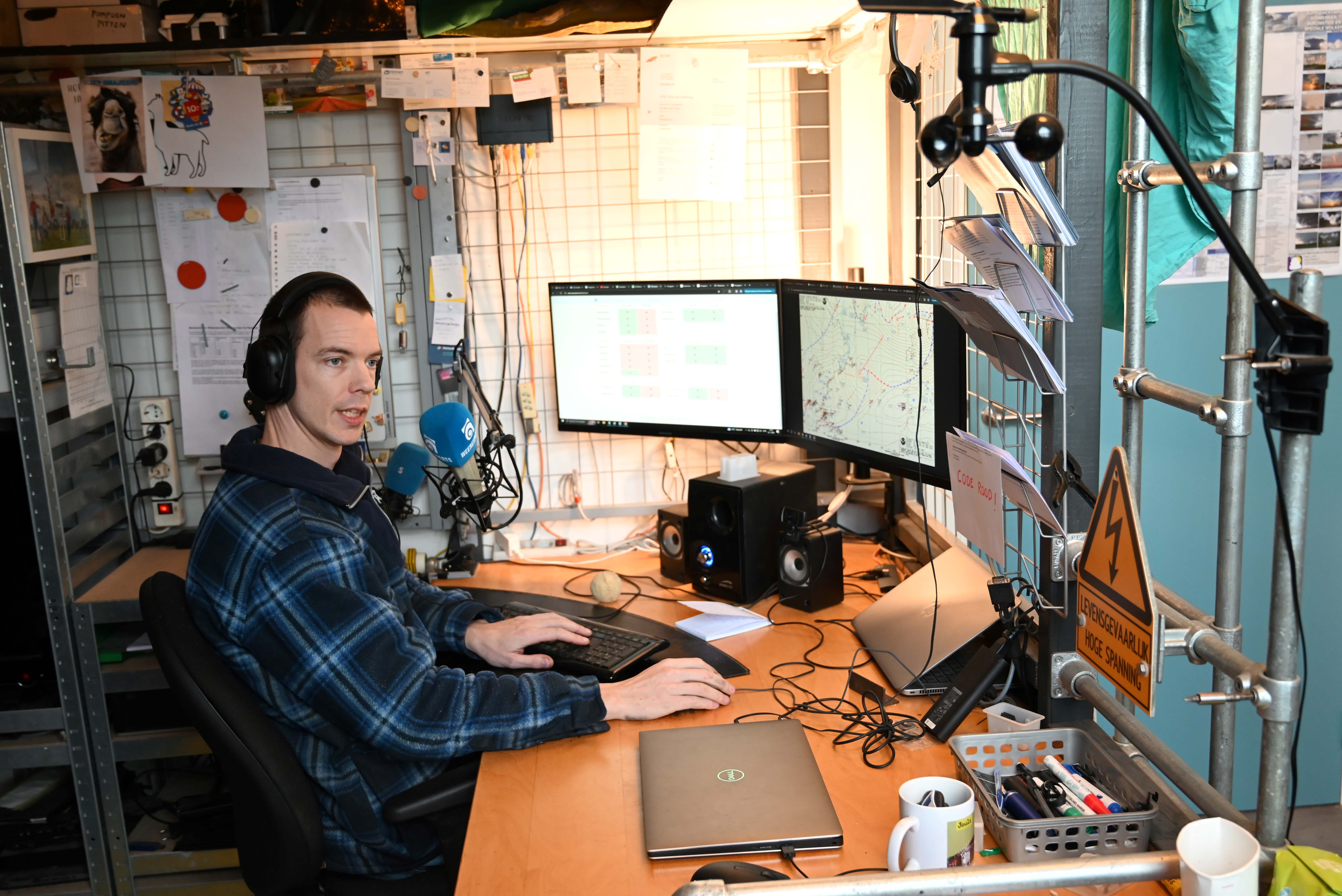 Hij vertelt gepassioneerd over alle meetinstrumenten die er in zijn meetstation te vinden zijn. Alle metingen over neerslag, temperatuur, zonuren, windsterkte en windrichting kunnen afgelezen worden op de computer op zijn werkplek.