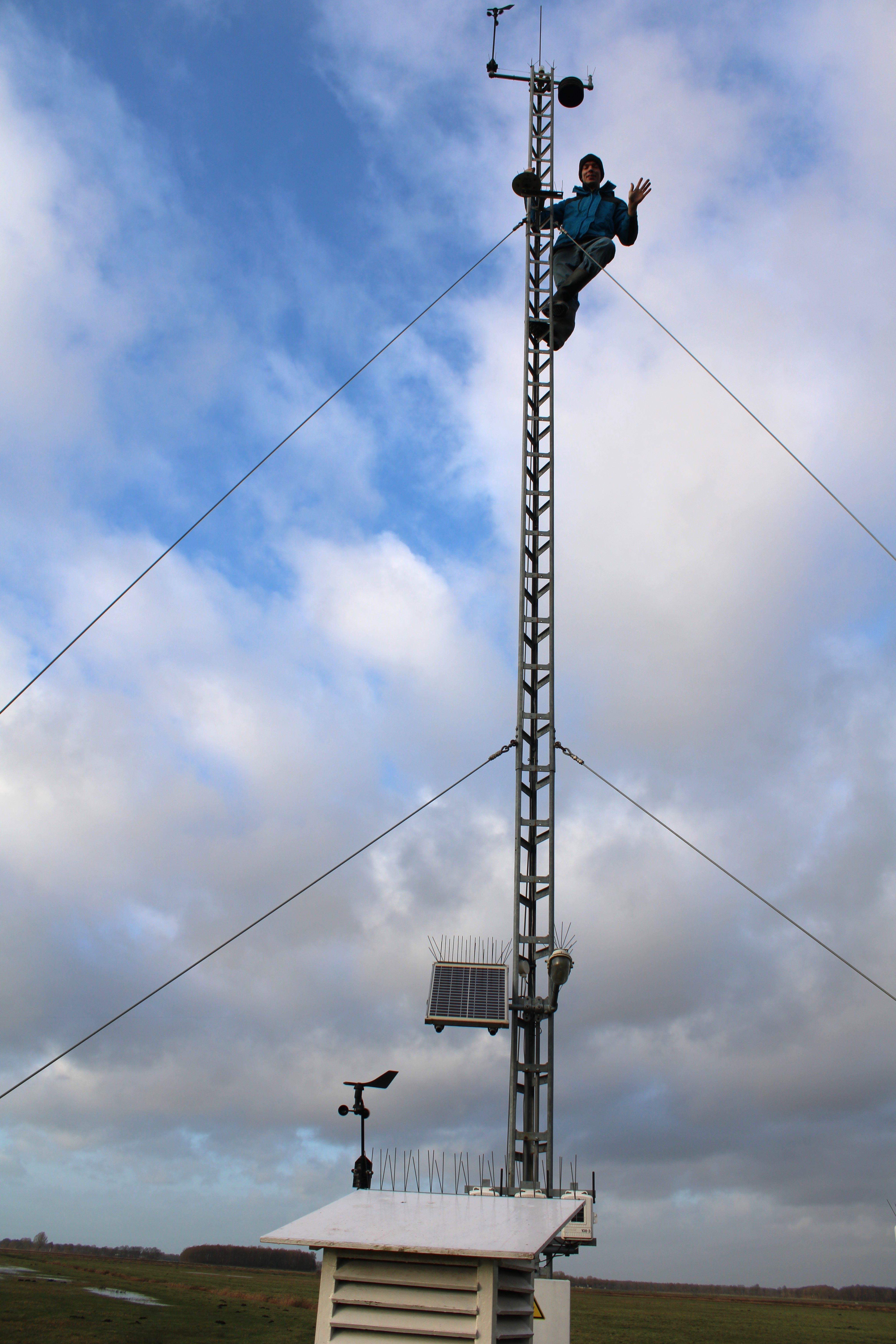Op 10 meter hoogte zit een van de windmeters. Hans klimt lenig in de mast om de meter te controleren. Weermannen moeten niet alleen slim zijn, maar ook over een goede lichamelijke conditie beschikken!