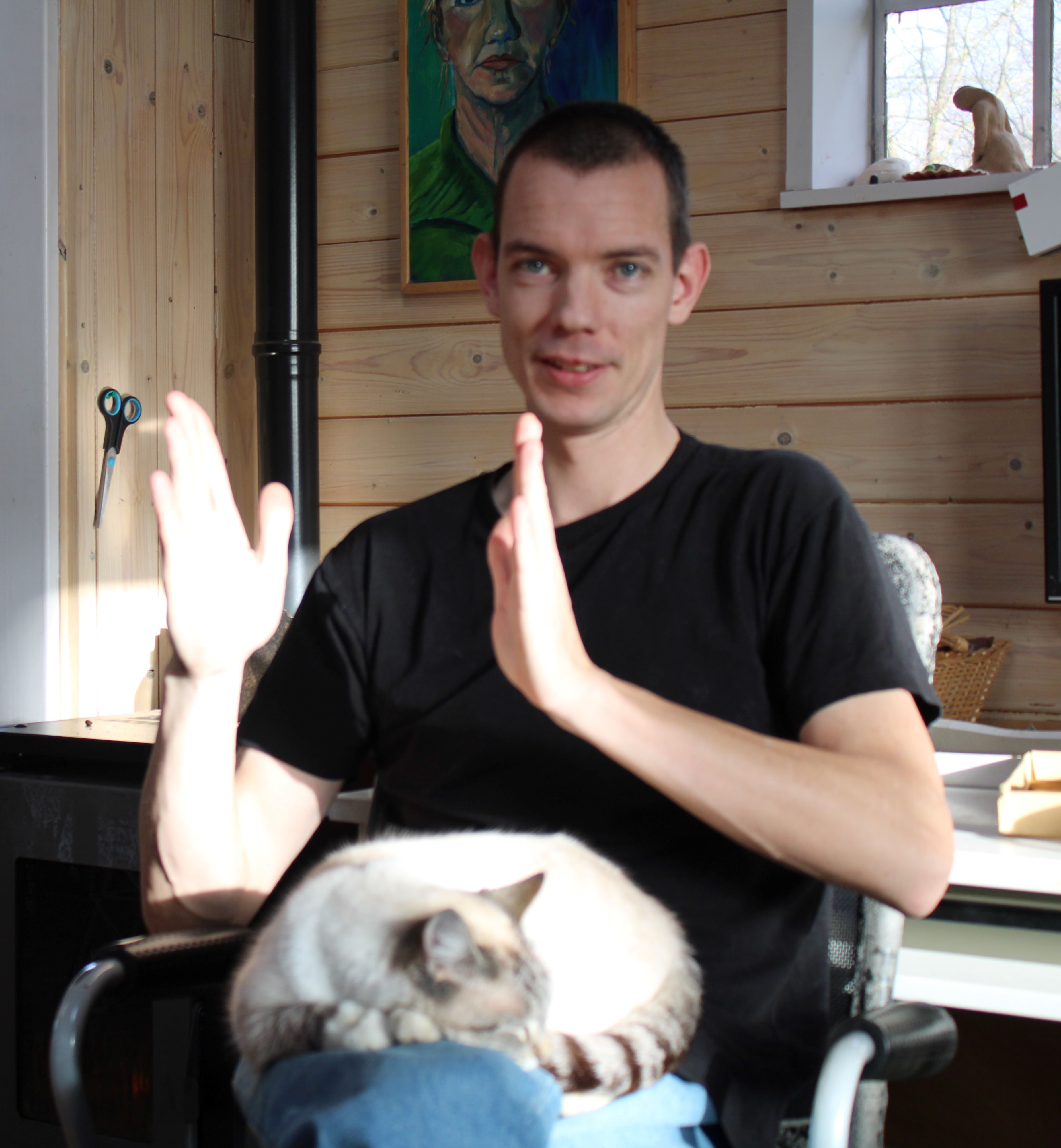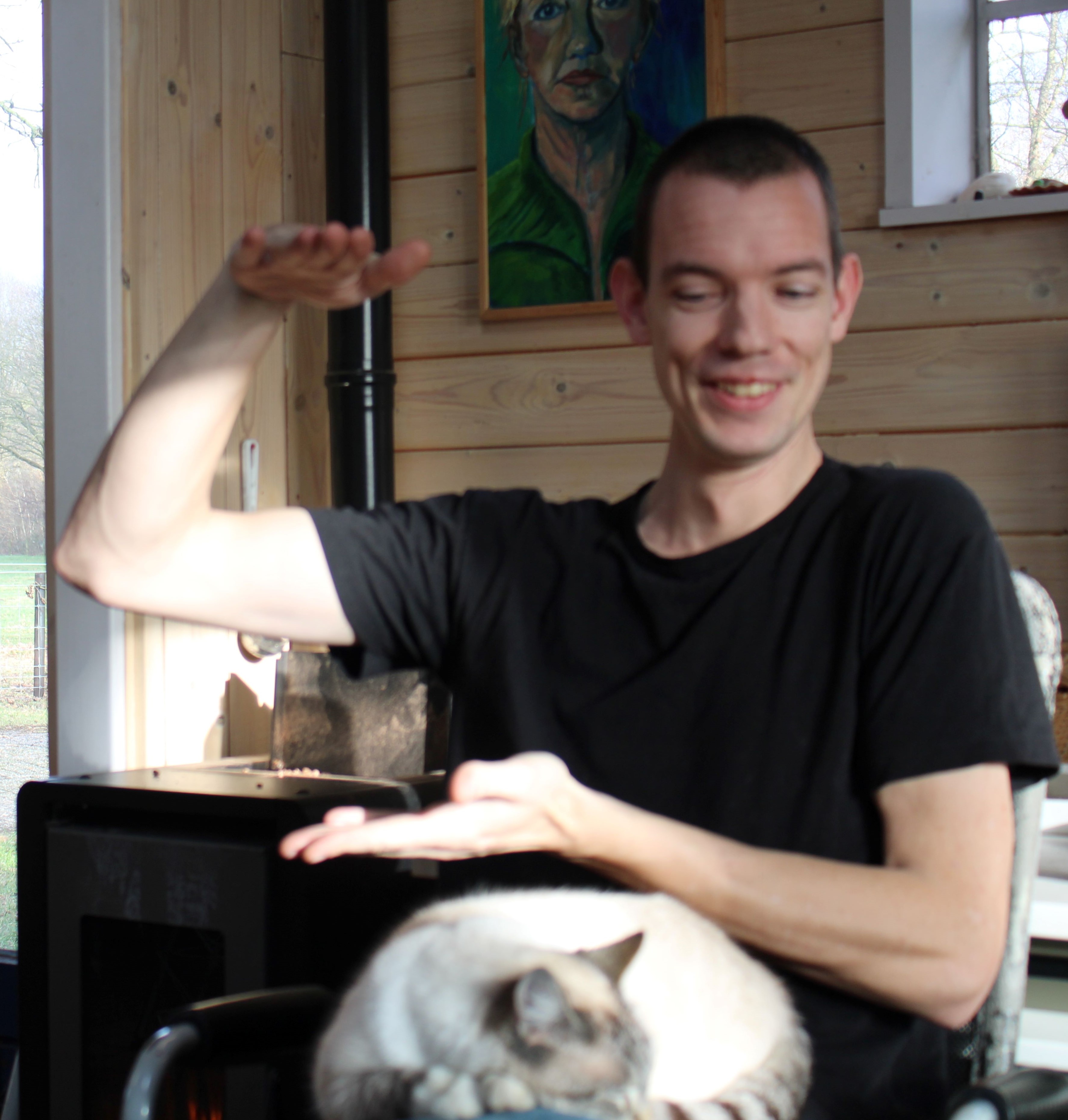 De pelletkachel snort in het atelier en er wordt meteen koffie gezet. Hans is een begenadigd spreker en het is dan ook een genot om naar zijn verhalen te luisteren.