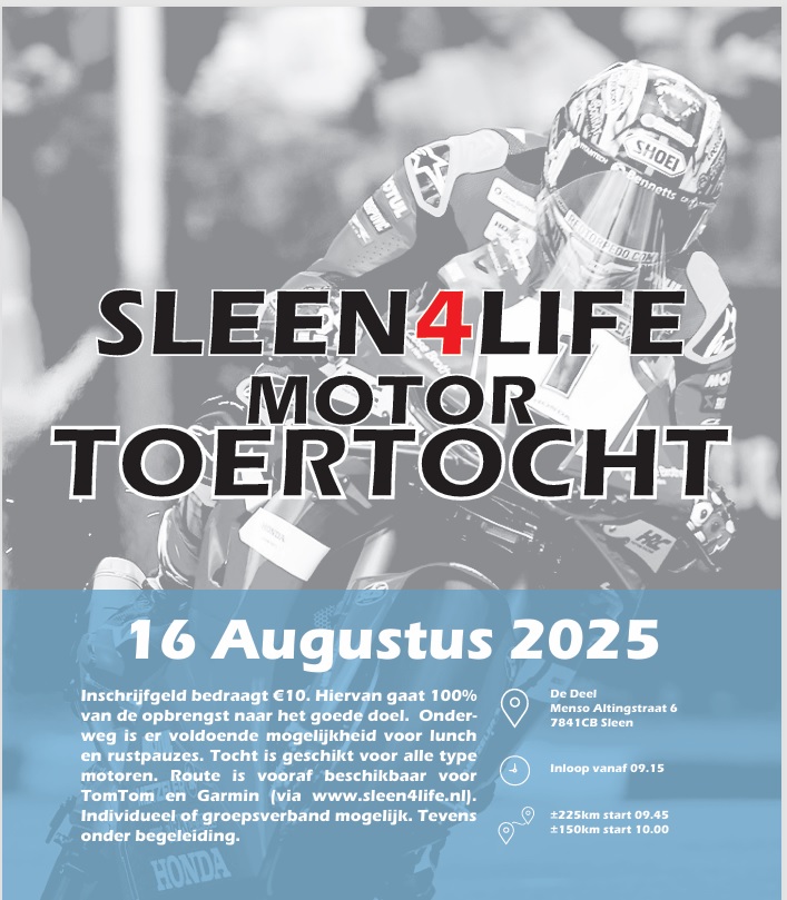 Op zaterdag 16 augustus organiseert Sleen4life weer een motortoertocht. Trienus Dunning en Gert Scholten hebben twee mooie routes gemaakt. Een korte van 157 kilometer en een lange van 225 kilometer. Het inschrijfgeld van de motortoertocht (10 euro per persoon) komt geheel ten goede aan de palliatieve zorg voor mensen met kanker.