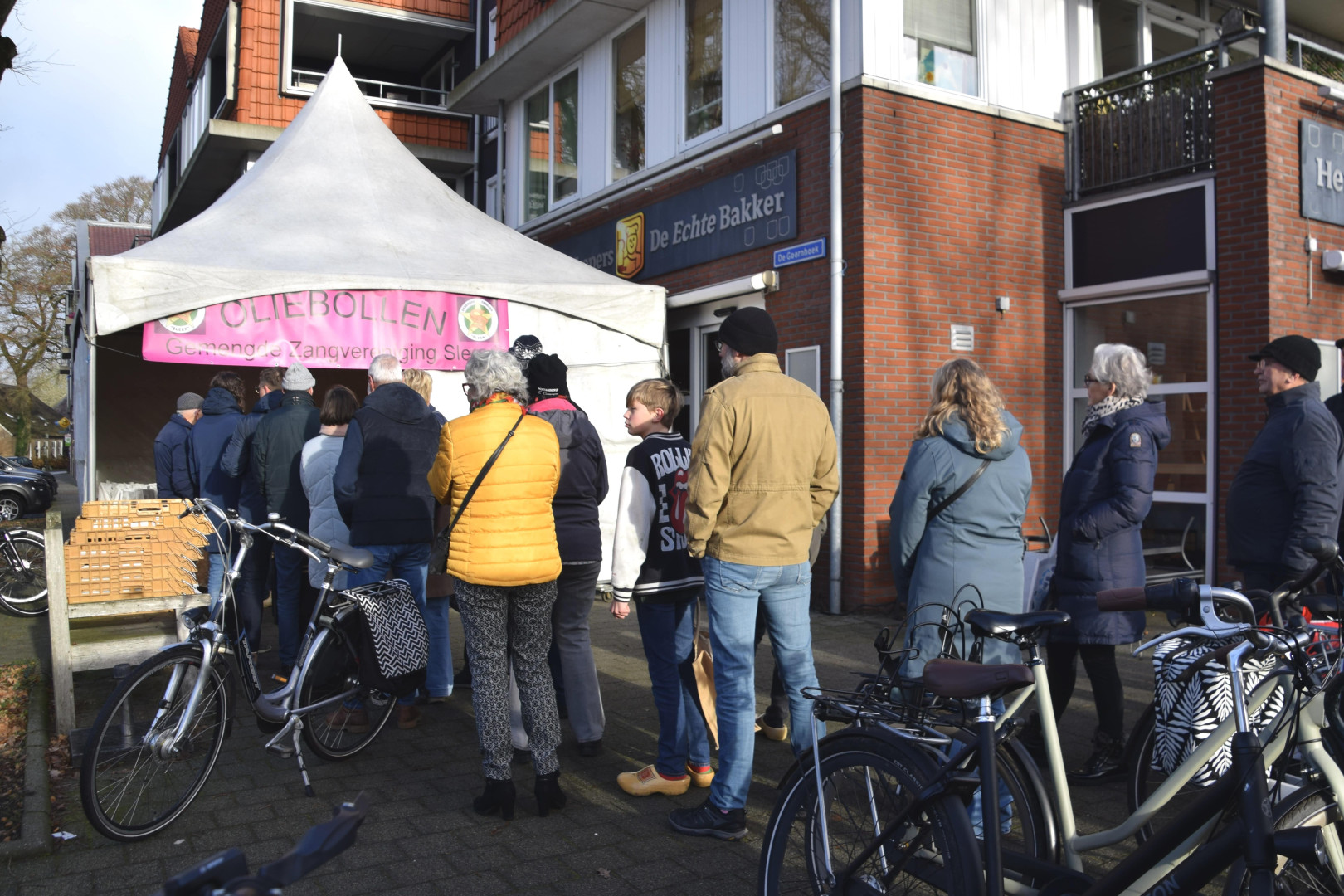 De zangvereniging heeft een aparte tent aan de straatzijde en wordt duidelijk aangegeven. Oliebollen naturel of gevulde. Voor andere lekkere dingen konden mensen gewoon bij de bakker zelf terecht. De bakker had een tent aan de zijkant van de bakkerij neer gezet. Voor wie toch nog extra oliebollen wilde kopen, was er een apart team van de zangvereniging die dit regelde. Dit scheelde een hoop voor de wachtenden die alleen het bestelde kwam ophalen.