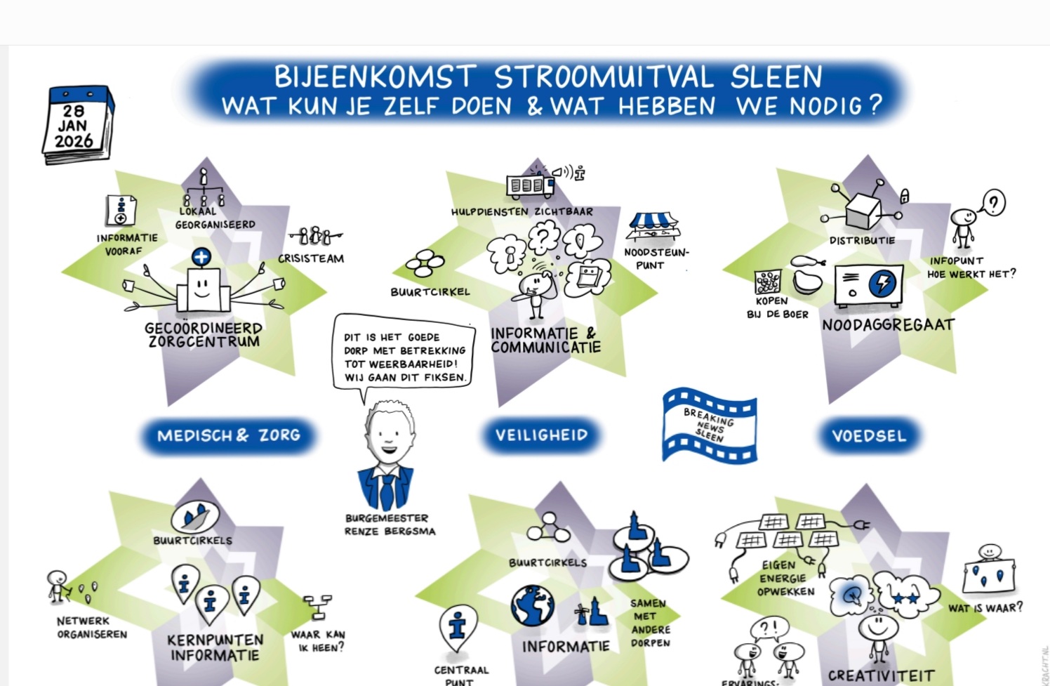 Woensdagavond 28 januari verzamelden ongeveer 60 personen zich in het MFC voor een bijeenkomst met als titel "Wat te doen bij een stroomstoring in Sleen?" Burgemeester Bergsma van de gemeente Coevorden opende de avond en sprak over het belang van een noodplan.