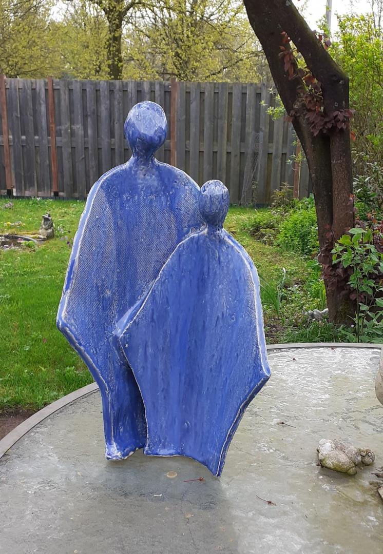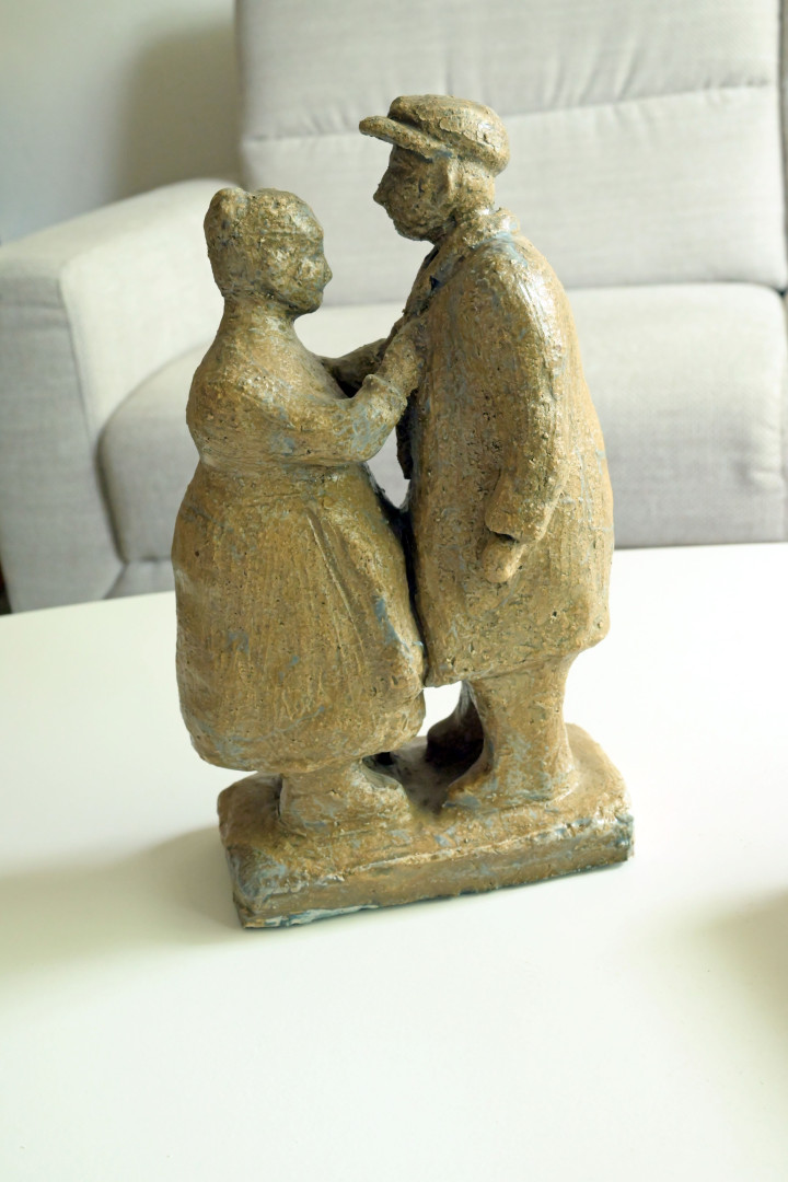 Dit verbeeldt haar pake en beppe uit Eastermâr Friesland (Oostermeer). Als pake op pad ging kon hij niet eerder de deur uit dan als beppe hem even de stropdas goed gedaan had, en eventueel wat afgeklopt, kortom gefatsoeneerd had. Dan kon hij op pad. Een terugkerend ritueel die bij Iepy is blijven hangen wat ze heel mooi verbeeld heeft in dit beeld. Dit maakte bij mij veel indruk.