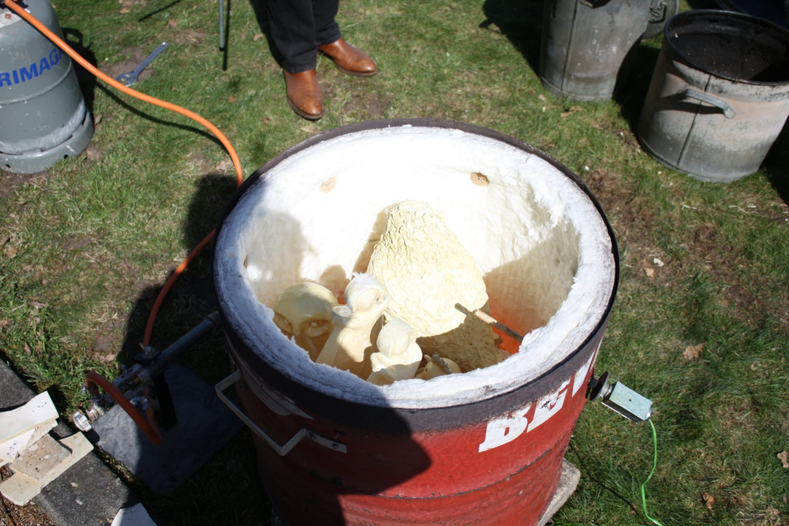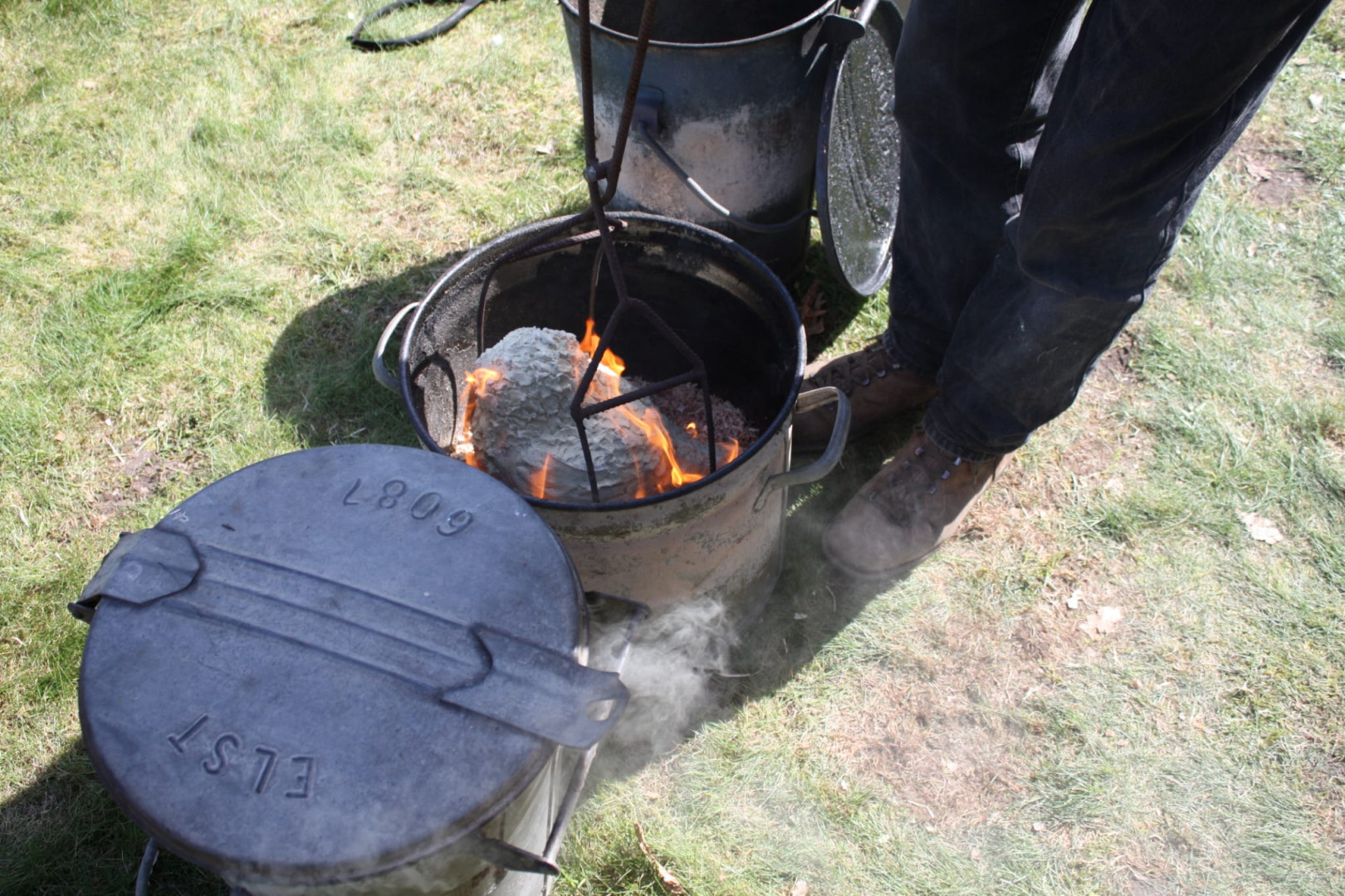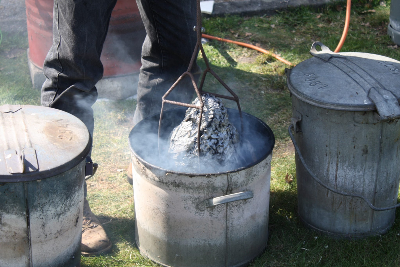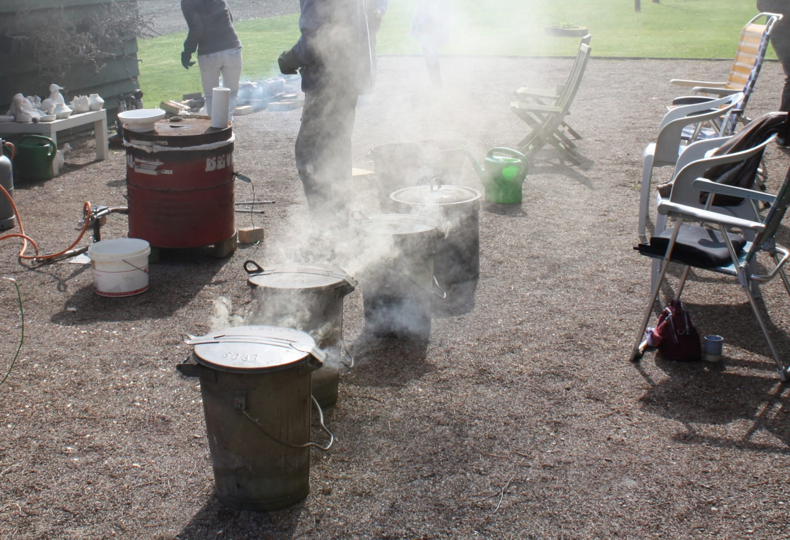 "Hier gaat de uil in de emmer waarin houtzaagsel ligt. Door de hitte die nog in de uil zit vanwege het bakken, vliegt het houtzaagsel in brand en ontstaat er rook.....deze rook trek in het beeld en dit trekt dan in het glazuur". (Rechts allemaal rookpotten waar keramiek in zit) .