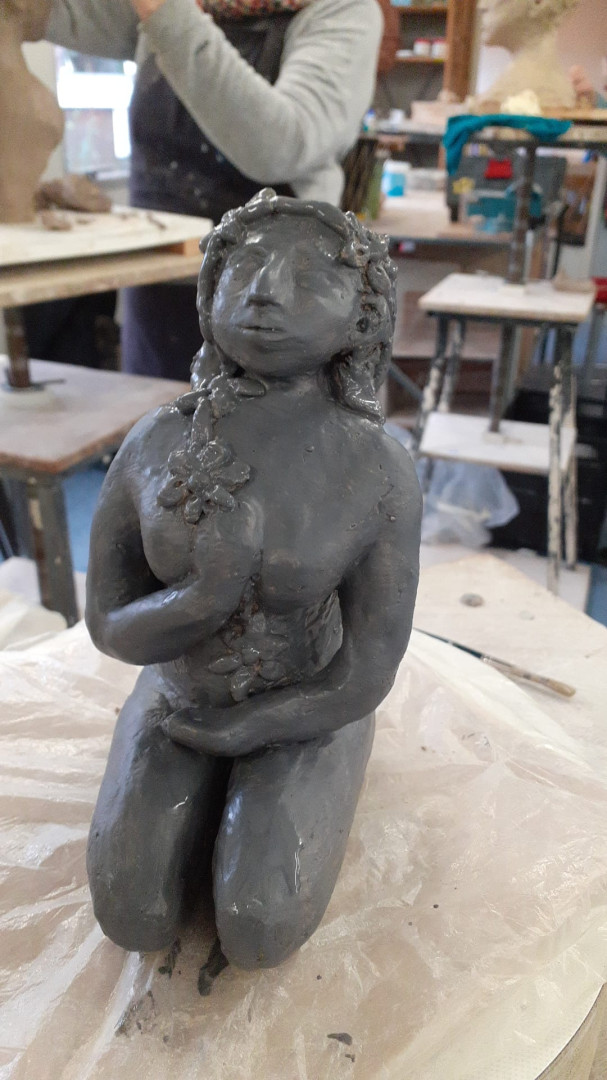 Iepy in het atelier bezig met een volgend kunstwerk. Een torso. Het voordeel van zo'n atelier waar meerdere mensen werken is, dat je veel tips krijgt, en ook inspiratie door wat anderen maken.