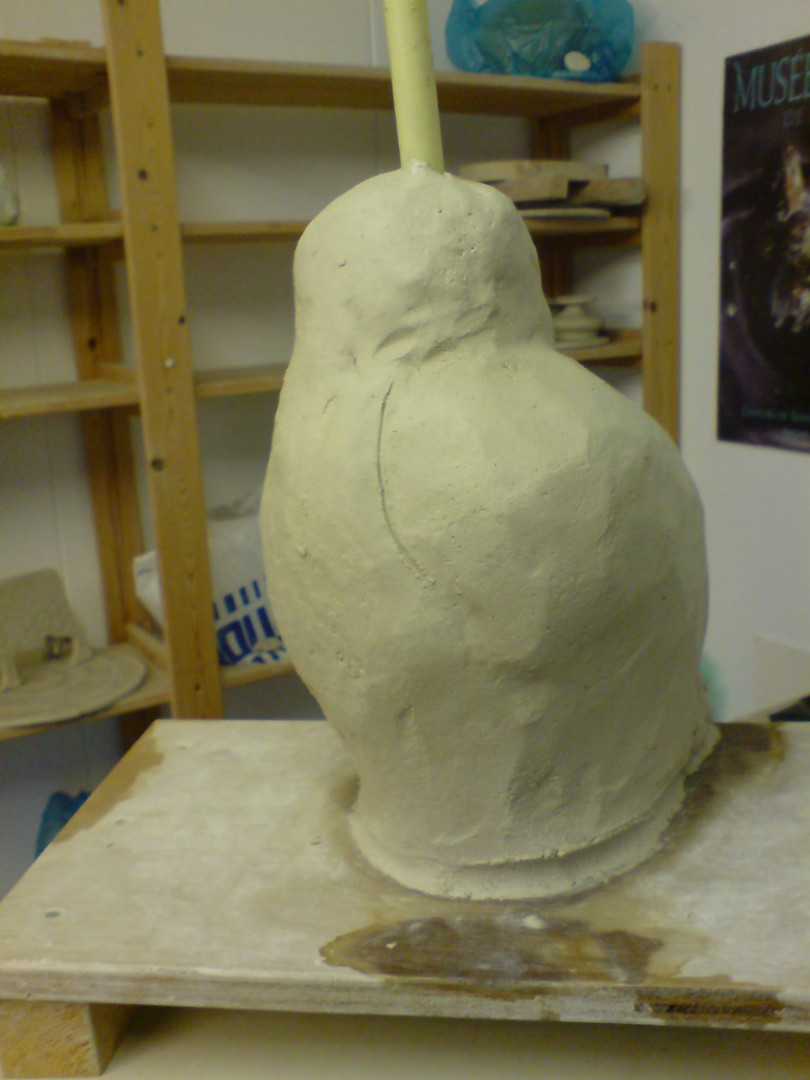 "Je begint zoals met alles met de vorm. Rechts: De uil zit in de buitenoven voor RAKU stook. Het deksel gaat er nog op".