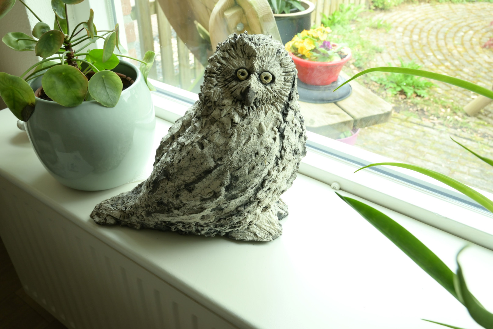 Al wandelend door de kamer beland ik bij deze mooie uil. "Symbool van wijsheid" (Dat is mooi meegenomen), die mooi in de vensterbank staat, naar buiten kijkend. Maar hoe krijg je die mooie structuren en echtheid erin? Ze legt het hieronder uit: