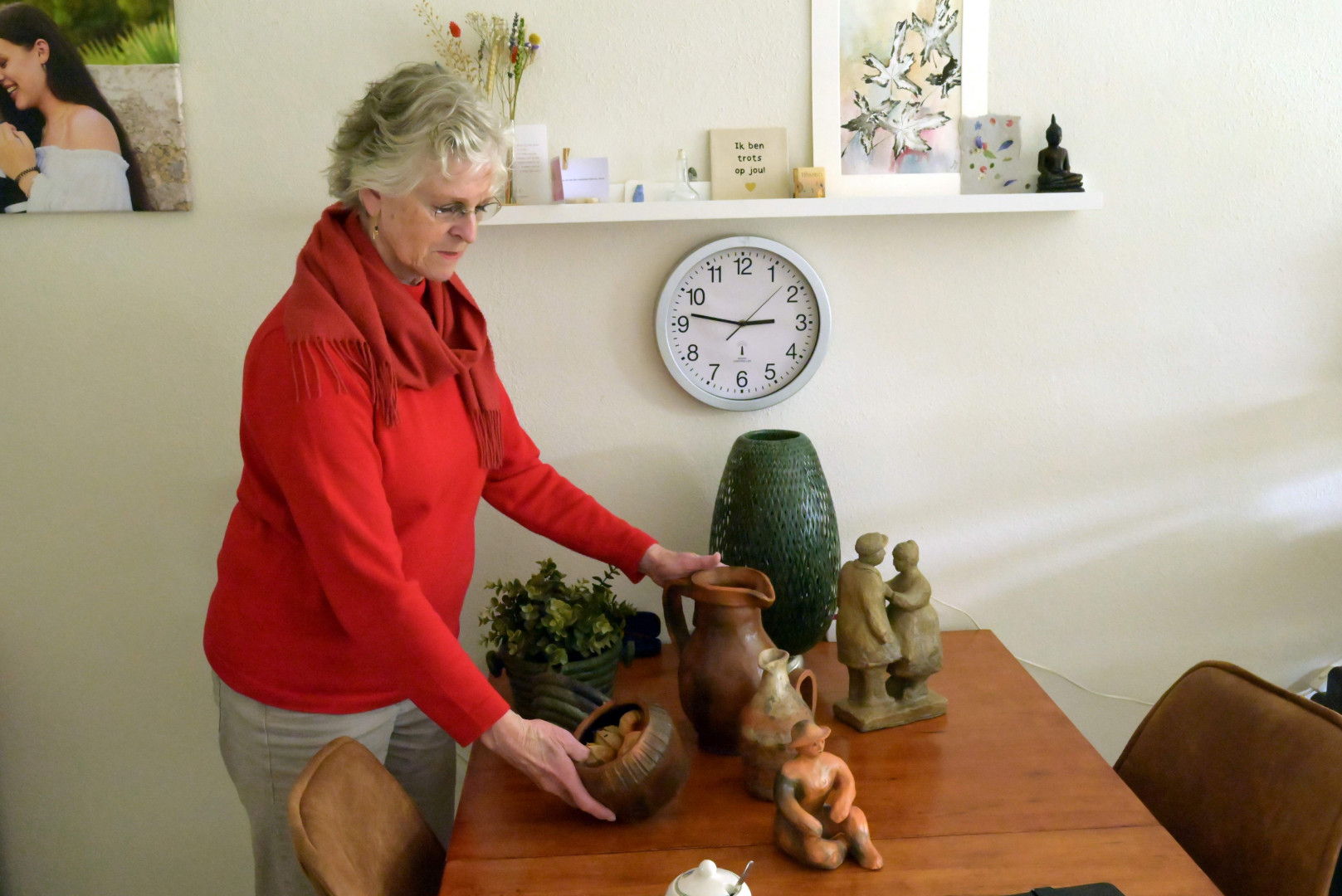 Er wordt even weer geschikt. Er is zoveel moois te zien. Eigenlijk woont ze in een galerie tussen alle eigengemaakte kunst.