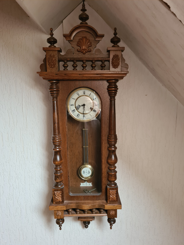 Goed werkende wandklok. Eikenhout. Geen antiek.